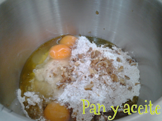 Ponemos el yogurt, aceite de oliva virgen extra, la harina integral, azúcar moreno, avena, levadura, los 3 huevos, nueces, canela y anís estrellado.